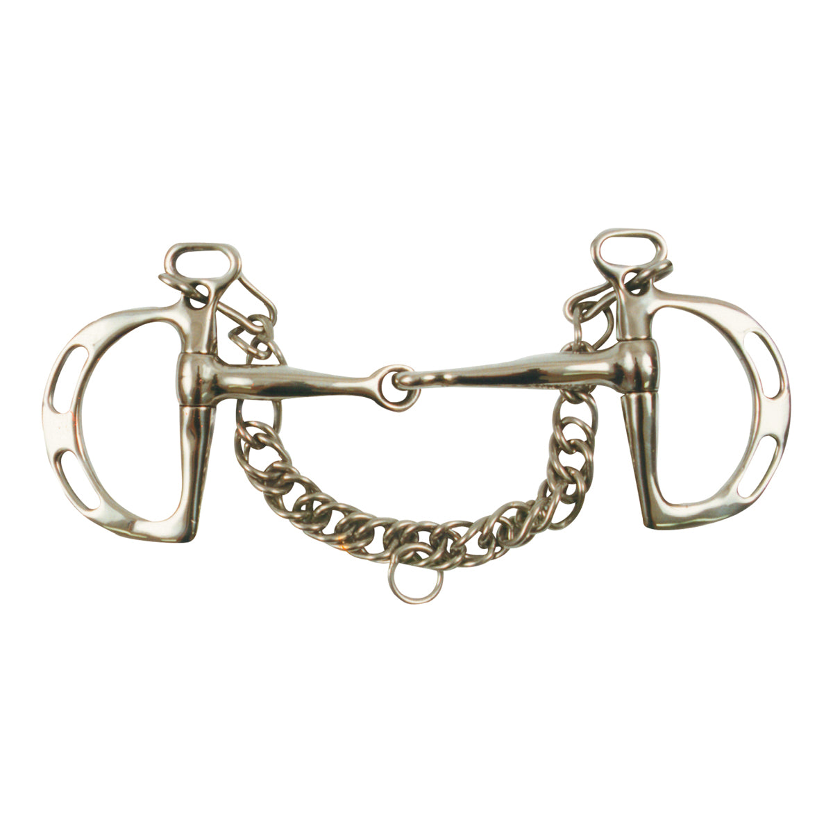 Jointed snaffle mouth for softer action with slotted rings allow for two rein positions, thus increasing or decreasing the curb action.