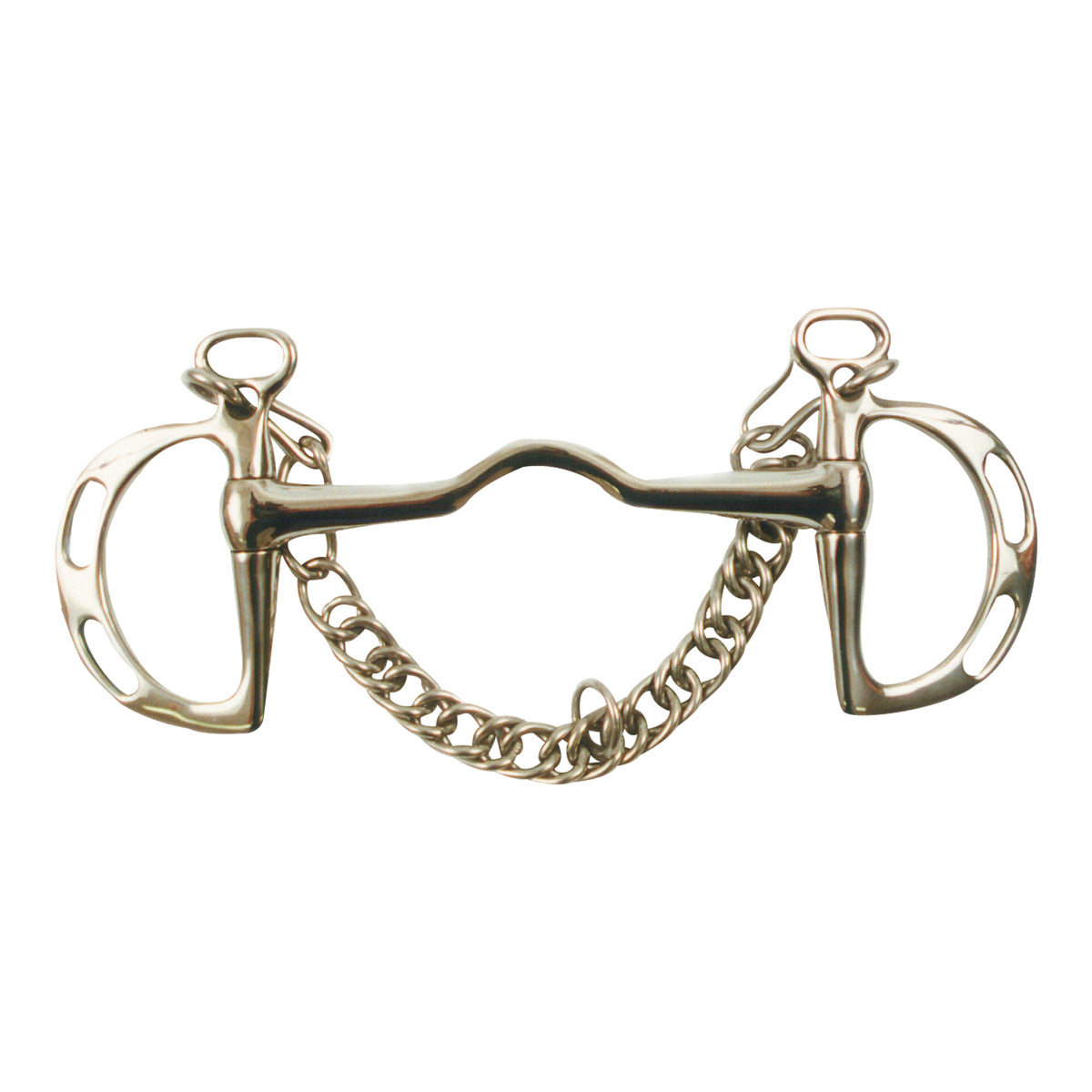 Port mouth bit with slotted rings allow for two rein positions, thus increasing or decreasing the curb action.