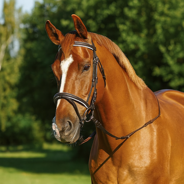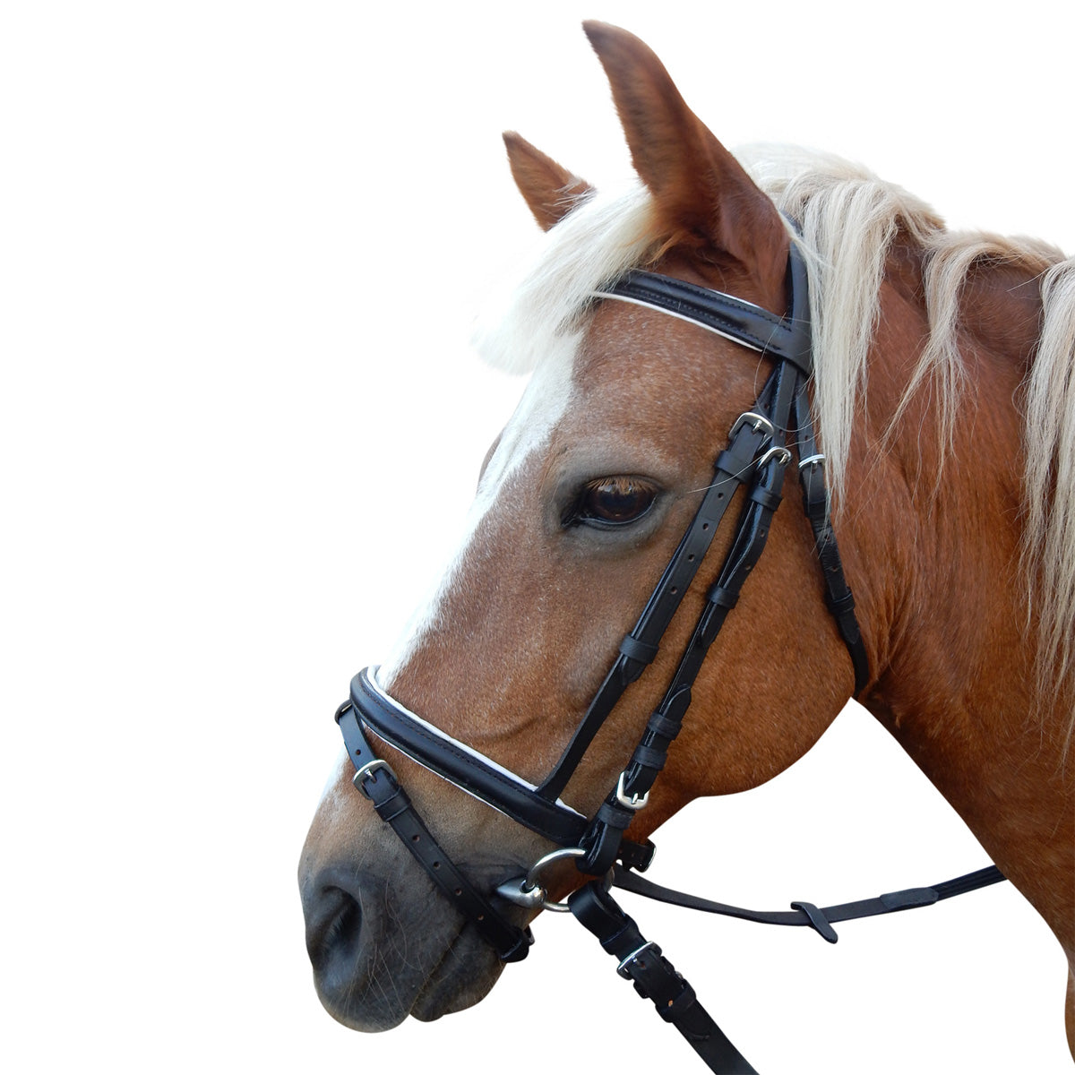 Eureka leather eventing bridle with Hanoverian noseband. This eventing bridle has contrasting white padding behind brow and noseband and comes complete with web reins.