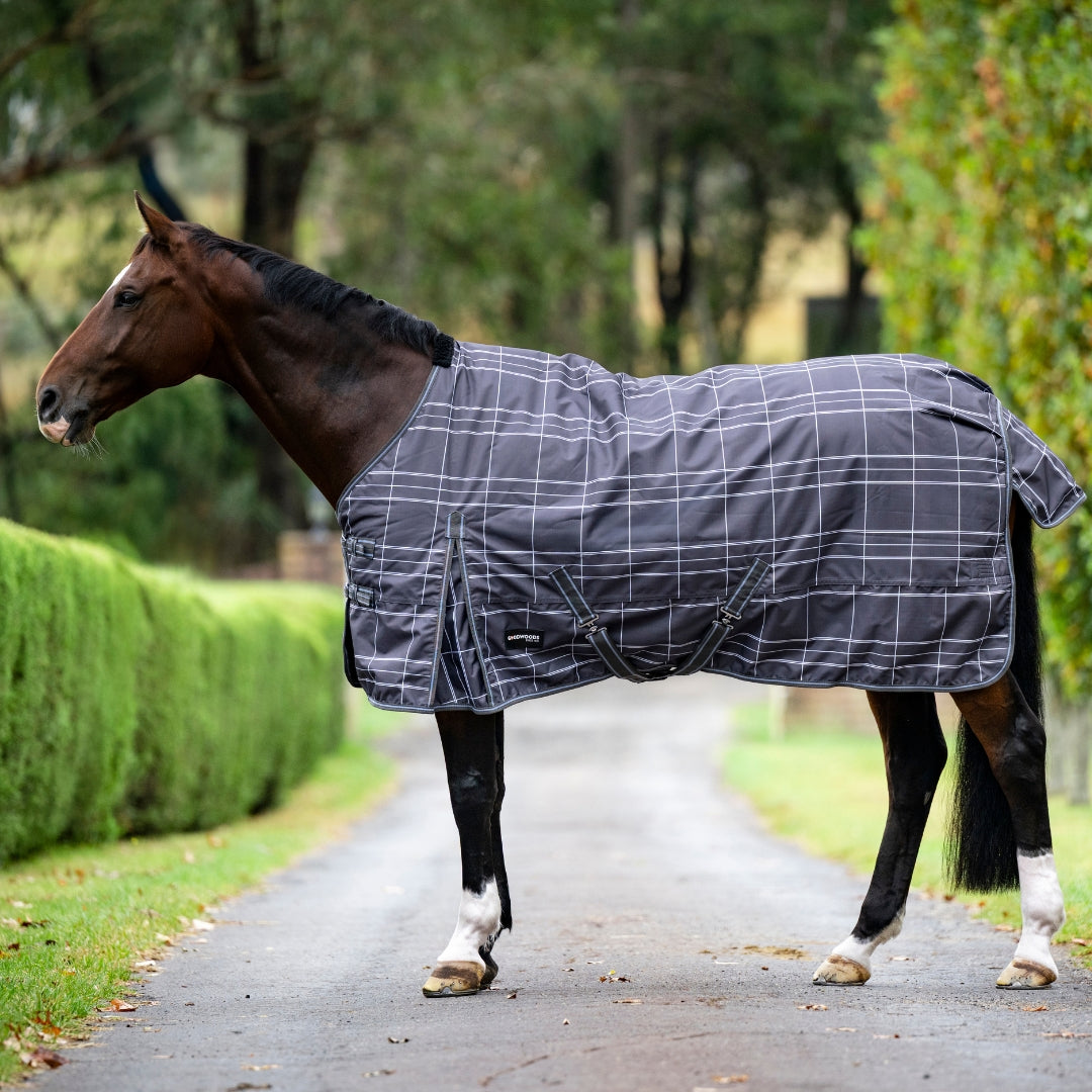 Keep your horse warm and protected during the colder months with the Charcoal Check 600D Winter Rug 100g. Designed for durability and comfort, this rug features: