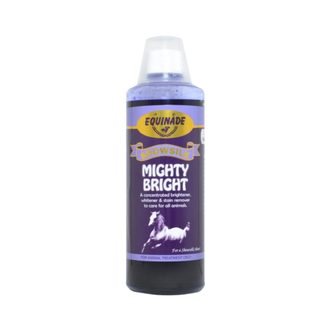 Equinade Showsilk Mighty Bright is a concentrated rinse that brightens, whitens and removes stains from animal coats, tails and manes. Equinade Showsilk Mighty Bright is a gentle water based formula that has been designed to: