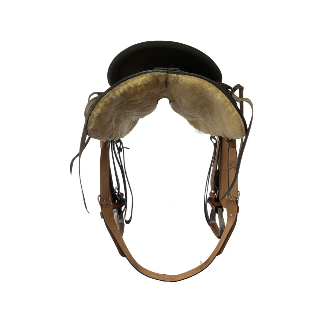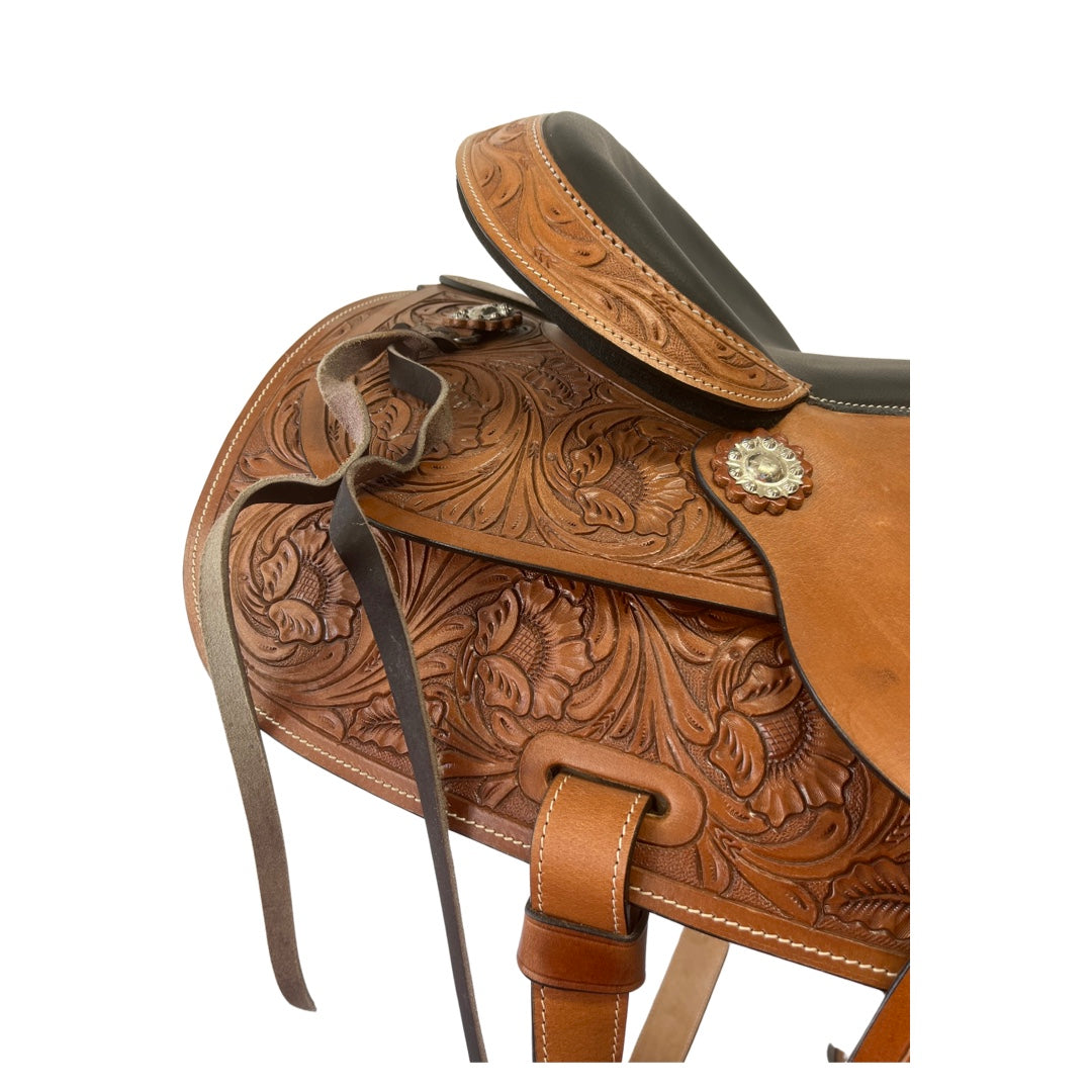 Complete with leather latigo straps, flank girth, string western girth, aluminium oxbows with leather treads and silver conchos and quick change buckle fenders.