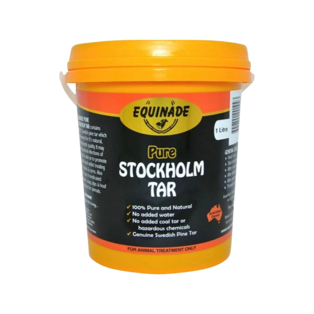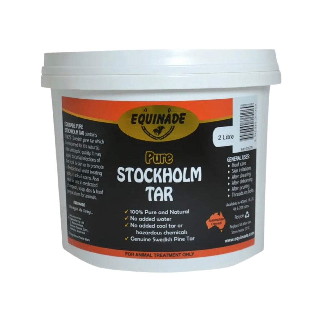 Equinade Stockholm Tar Suitable for: All horses and ponies to aid in the management of healthy hooves. Equinade products have been sharing in the caring of horses for over 30 years. An Australian owned company, Equinade have developed a range of quality products for horses - from hoof care products, to ShowSilk coat care, Equinade have everything you need to get your horse show ready! Equinade Stockholm Tar has been formulated from 100% Swedish pine tar to assist in the treatment of split hooves, split heels, cracks and corns. This non-toxic preparation does not contain water, petroleum based chemicals or carcinogenic creosote, and may also help to combat bacterial infections of the hoof and skin. 100% pure Swedish pine tar Natural antiseptic actions Assists in the treatment of split hooves, split heels, cracks and corns in horses Non-toxic, no petroleum based chemicals or carcinogenic creosote