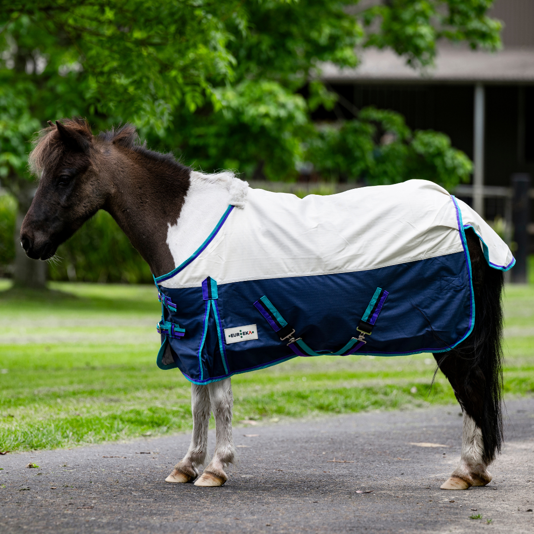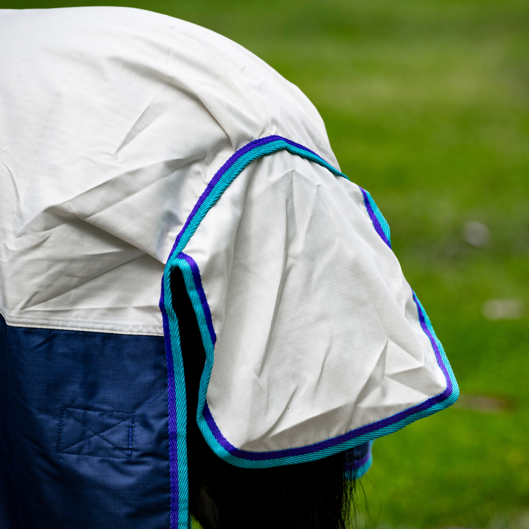 600 Denier waterproof outer rug with polyester cotton lining, satin shoulders plus short x -over double surcingles, double chest fittings, lined tail flap, rump darts, high shoulder gussets and removable leg straps.